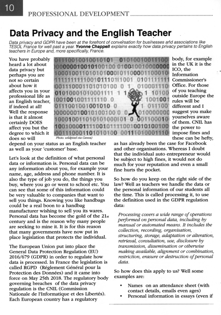 Data Privacy Professionals works in collaboration with various structures and organizations, including associations under the law of 1901. TESOL is an association of English language teachers. In an article, Yvonne Chappell wrote on the following theme : “Data Privacy and the English teacher”, in order to show the impact that this international law has had on our daily lives, and here more specifically on the lives of teachers and their students.