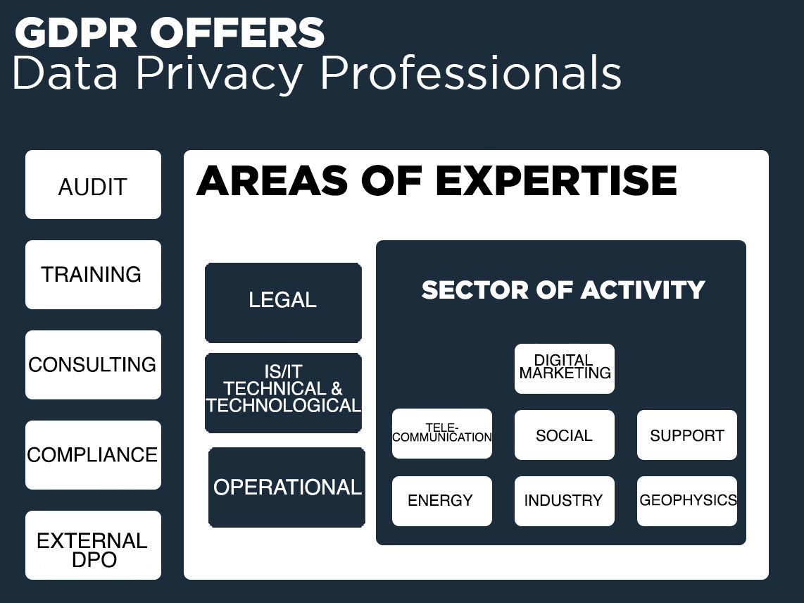 Our experience in regards to GDPR compliance projects covers a diversity of fields of activities, such as digital marketing, telecommunication, assistance in the social field, IT technical support, energy, transportation, heavy industry and geophysics. Thanks to our fields of expertise, which are technical, technological and operational, in addition to the legal framework; Data Privacy Professionals offers GDPR services tailored to your company’s needs.