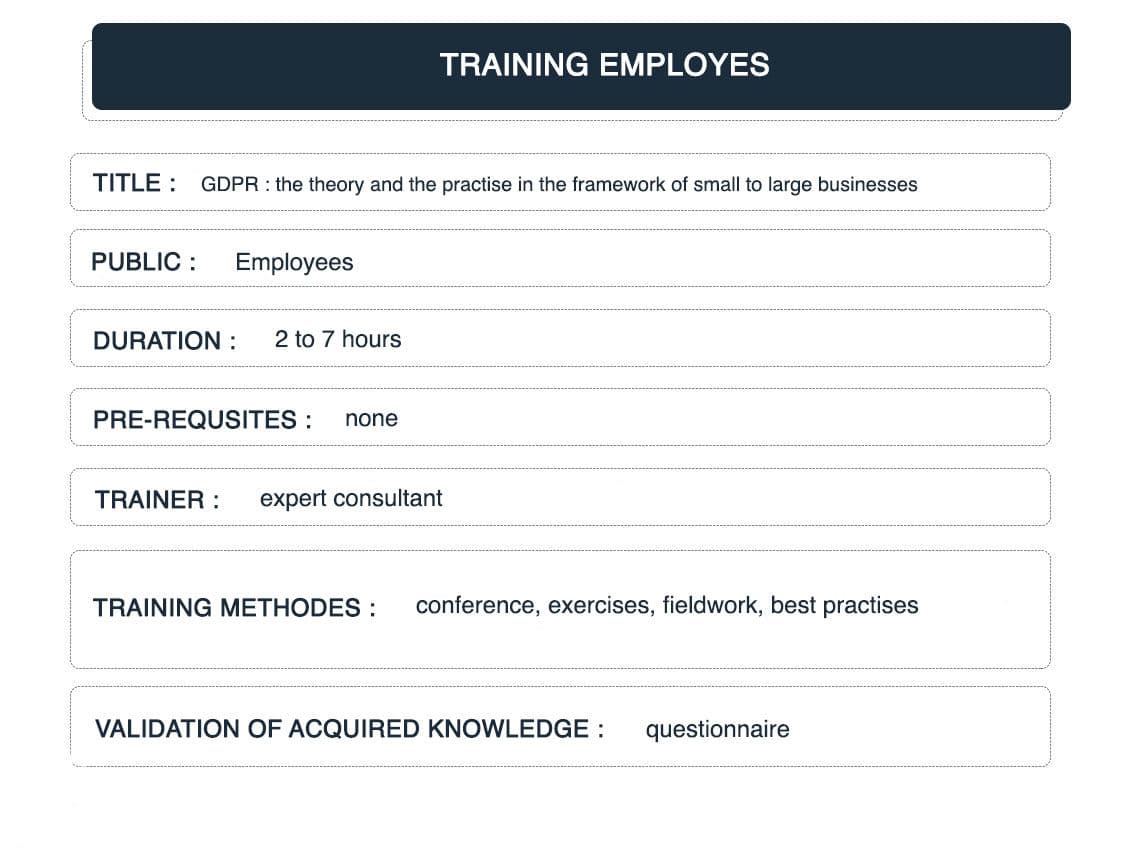 GDPR: putting theory into practice for VSBs, SMBs, and MSBs. This training course is intended for your employees, associates, and subcontractors so that they can grasp baseline principles, GDPR challenges, and implement good practices.