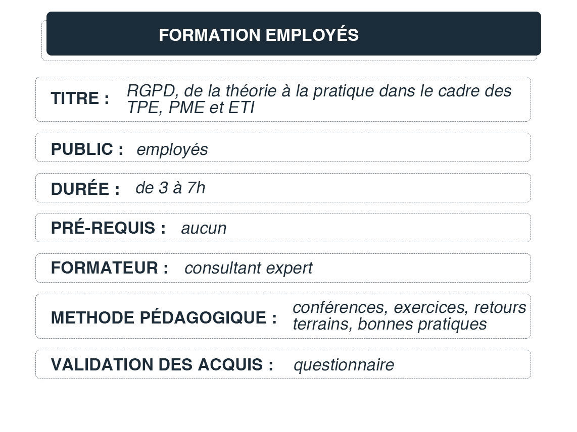 La formation est à destination de vos employés, collaborateurs et sous-traitants afin qu’ils comprennent les principes de base, les enjeux du RGPD et adhèrent à la mise en œuvre des bonnes pratiques.