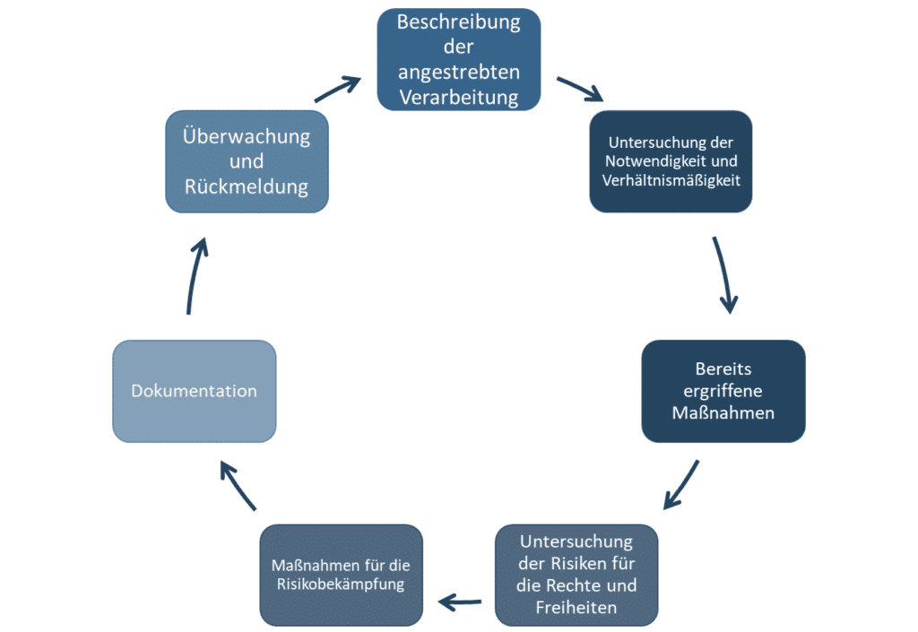 Ist erst einmal die Entscheidung gefallen, dass eine Datenschutz-Folgenabschätzung nötig ist, können verschiedene Verfahren angewandt werden. Die DSGVO schreibt hierbei, auf Grund Individualität einer jeden einzelnen Datenschutz-Folgenabschätzung, nicht die Nutzung eines bestimmten Formats oder einer bestimmten Software vor und setzt auch kein festgelegtes Verfahren vor. Sie formuliert ausschließlich folgende Mindestforderungen für den Inhalt der Datenschutz-Folgenabschätzung: