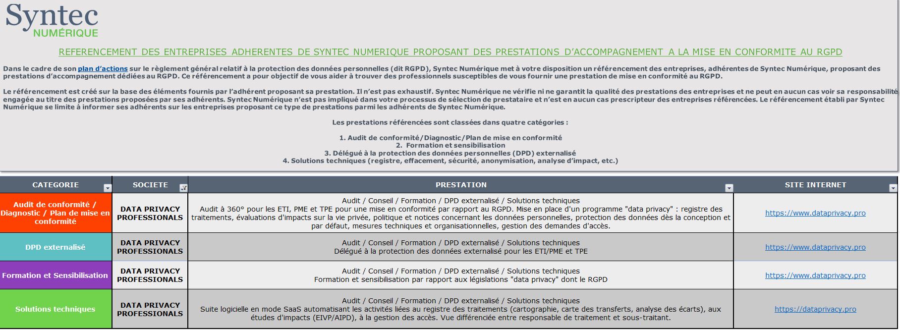 Data Privacy Professionals referenced by Syntec Numérique as a GDPR (RGPD in French) actor on the French “data privacy” market in the categories: